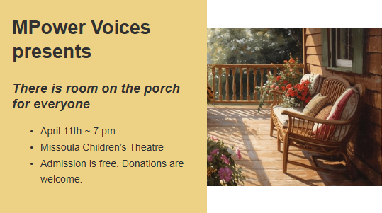 There is room on the porch for everyone Saturday, April 11, 2026 7:00 PM 8:00 PM Missoula Children's Theatre 200 North Adams Street Missoula, MT, 59802 United States (map) Google Calendar ICS Your donation is gratefully accepted here.